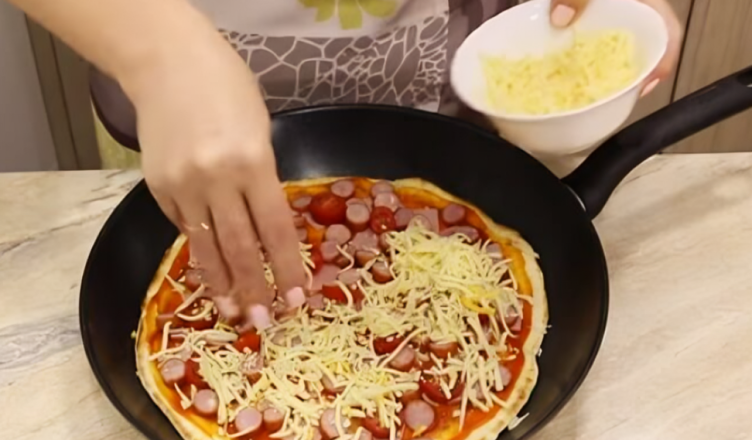 9. Postaw patelnię na ogniu, ustaw ogień na mały. Przykryj patelnię pokrywką. Smaż, aż ser się roztopi. Minęły 3 minuty. Pizza jest gotowa.