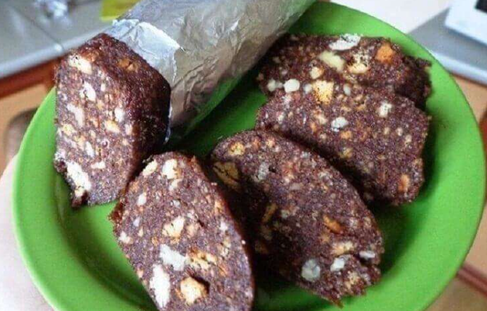 - Dodaj posiekane orzechy i ciasteczka. Wyłóż masę na folię i uformuj ją w kształt kiełbaski.